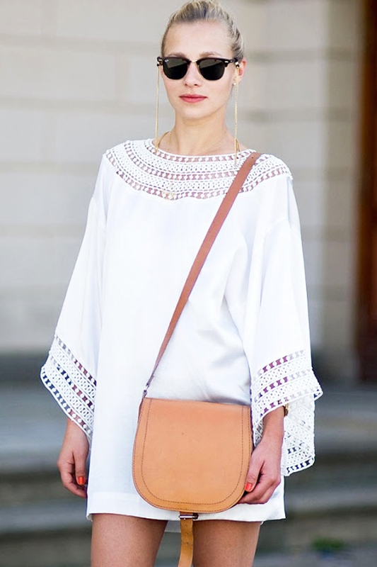 白色网眼裙装+棕色水桶包