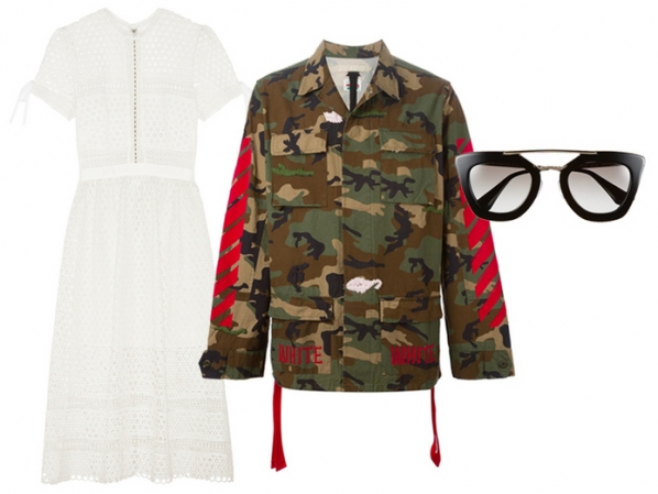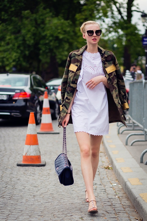 LOOK 1 :白色镂空连衣裙+迷彩外套+一字带凉鞋+链条包