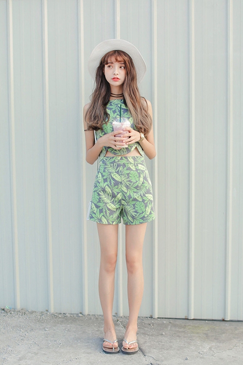 示范搭配:白色草帽+印花背心短袖两件套+银色拖鞋