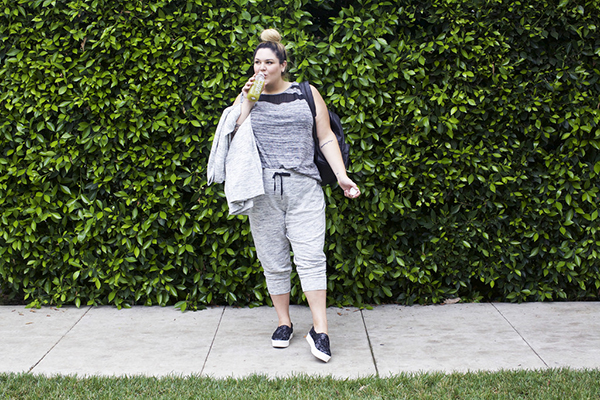 全身搭配:灰色T恤+灰色休闲裤+黑色涂鸦乐福鞋+黑色双肩包