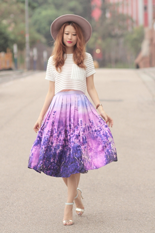 示范二:裸色阔边帽+白色条纹短款上衣+薰衣草印花裙+白色露趾凉鞋
