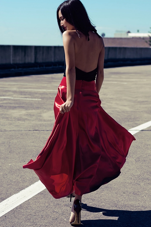 大红色连衣裙搭配:黑红拼色露背连衣裙+黑色尖头细高跟