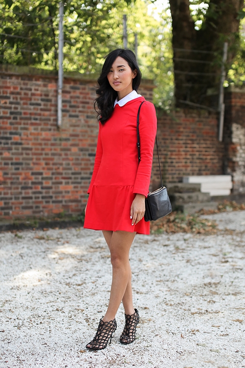 大红色连衣裙搭配:红色直筒娃娃领连衣裙+黑色楼红鱼嘴凉鞋+黑色肩包