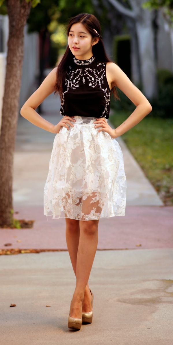 示范一:黑色高领钉珠背心+白色蕾丝裙+金色高跟鞋