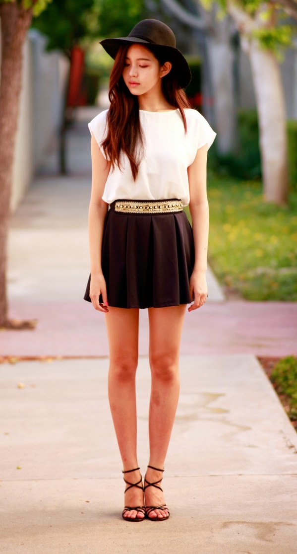 示范二:黑色阔边帽+白色雪纺上衣+黑色短裙+黑色罗马鞋