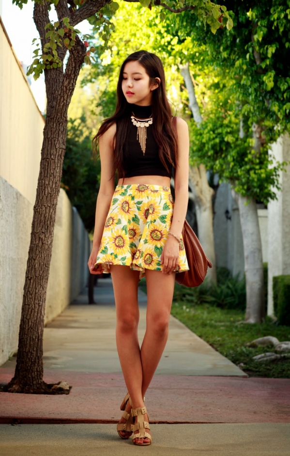 示范三:黑色高领背心+向日葵A字裙+裸色凉鞋+棕色肩包