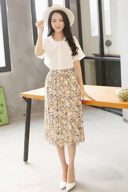 示范一:白色草帽+白色娃娃领短袖衬衫+碎花长裙+白色尖头高跟鞋