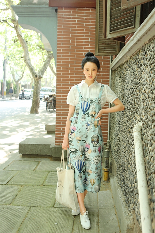 示范二:白色琴褶短袖衬衣+蓝色印花背带长裙+帆布手袋+白色休闲鞋