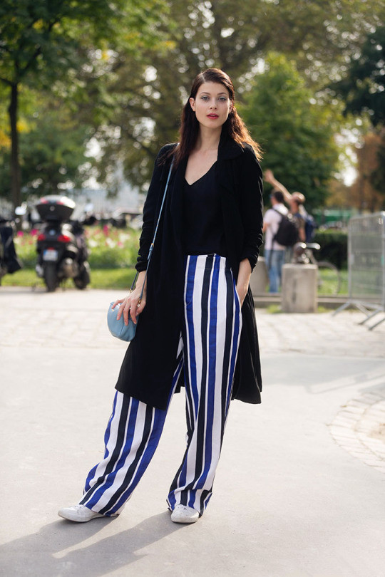 搭配看点:条纹阔腿裤搭配条纹上衣简直chic到爆,不过,也要超高的自信才能轻松hold住。并且,色彩尽量控制在两三种之内,款式也要简洁有力才时髦,鞋子就像时装精奥利维亚巴勒莫这样,越简洁越抢镜。