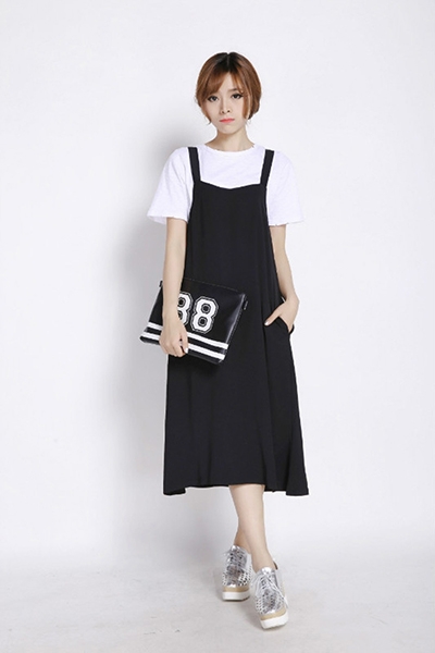 示范搭配二:白色T恤+黑色背带裙+银色松糕休闲鞋+黑色手包