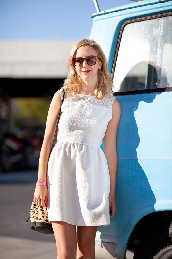 搭配点评:白色泡泡袖连衣裙的款其实超梦幻的适合很多有公主梦的女生。不过肩宽的女生就还是算了,那会让你看上去有点壮。其实这套搭配的选色就是使用了黑白的百用配色,不简单的原因是在于衣服的设计感。