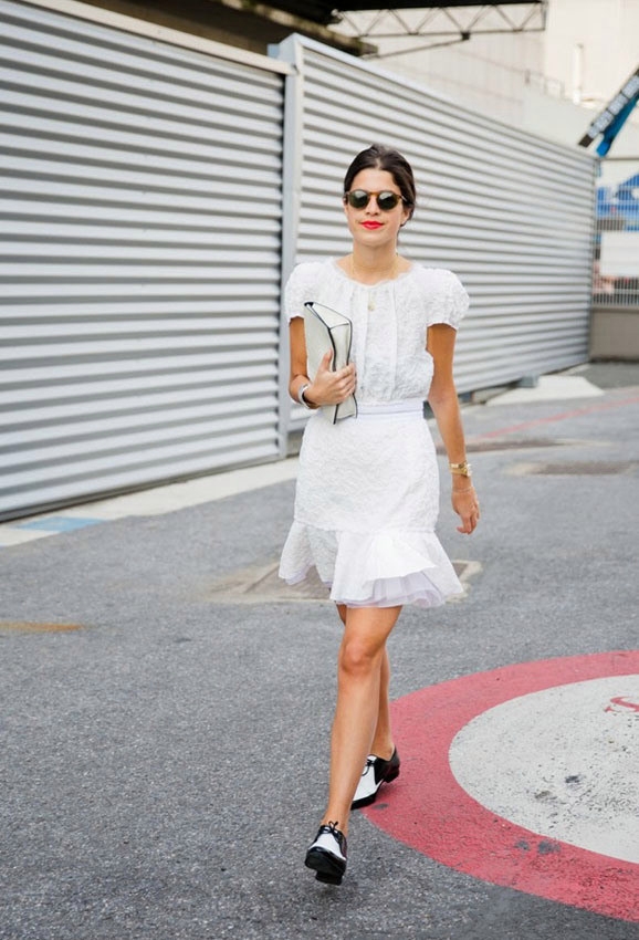 全套搭配:白色泡泡袖连衣裙+白色手包+黑白拼接皮鞋