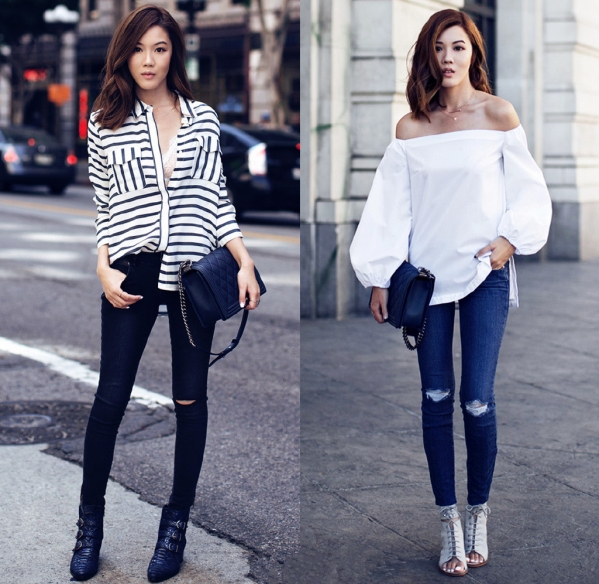 LOOK 2:一字领白衬衫+紧身牛仔裤+链条包