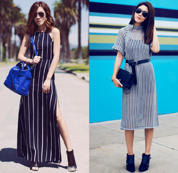 LOOK 3:条纹长裙+鱼嘴踝靴+宝蓝色斜挎包