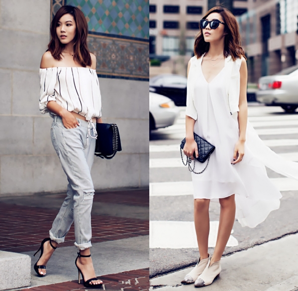 LOOK 17:一字领露肩衬衫+boyfriend破洞裤+一字带高跟鞋