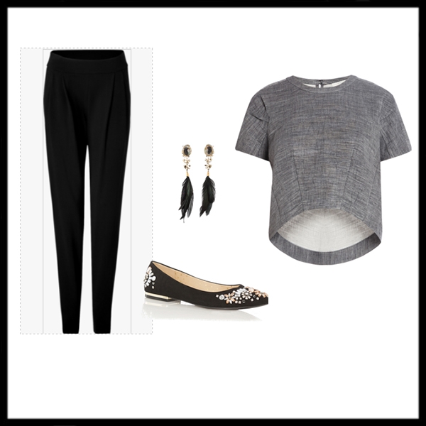 全身搭配:黑色哈伦裤+灰色短款T恤+黑色钉珠单鞋+黑色羽毛耳环