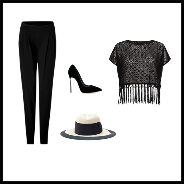 全身搭配:黑色哈伦裤+黑色流苏T恤+黑色高跟鞋+黑白礼帽