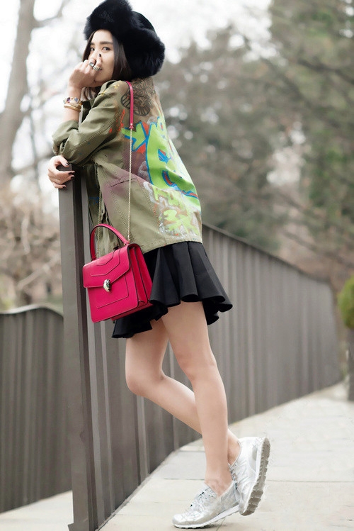 绿色涂鸦风外套+黑色半裙+玫红色链条包+灰白拼色运动鞋