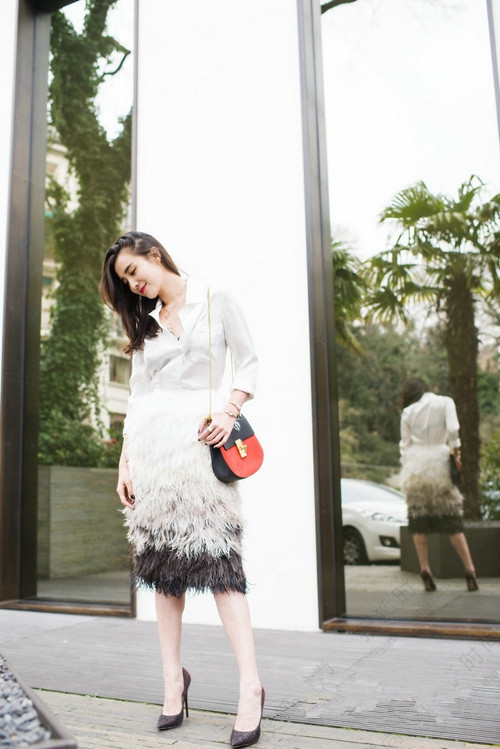 白色衬衫+毛绒高腰裙+棕色高跟鞋+拼色链条包
