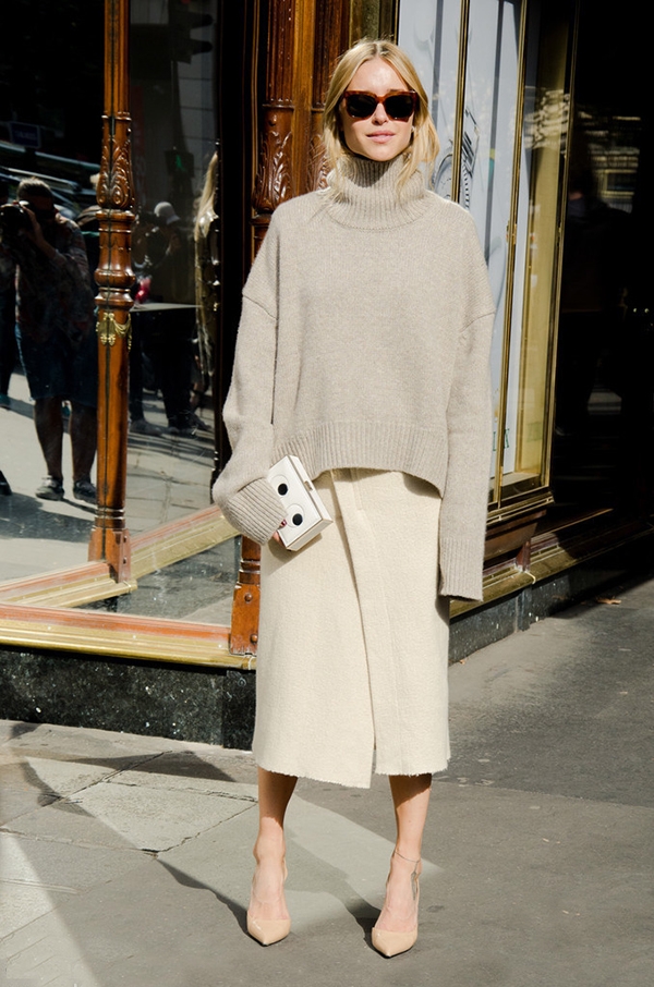 到了冬天繁复的搭配让人花了眼,怎么做到搭配干净大方呢?挑选一条纯色的裙子是个不错的选择,没有别的色彩来添彩但搭配针织衫穿就很出彩。
