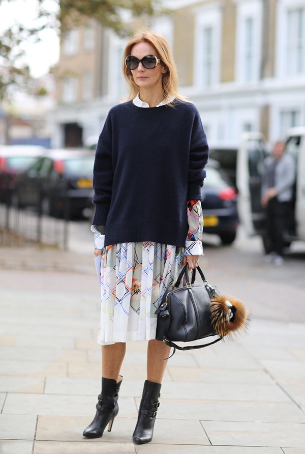深蓝色针织衫+印花连衣裙+黑色高跟靴+黑色手包