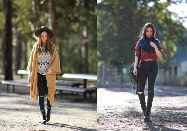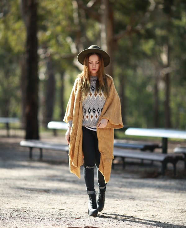 左图全套搭配:黑色礼帽+灰色毛衣+土色毛线披风外套+黑色破洞牛仔裤+黑色高跟靴