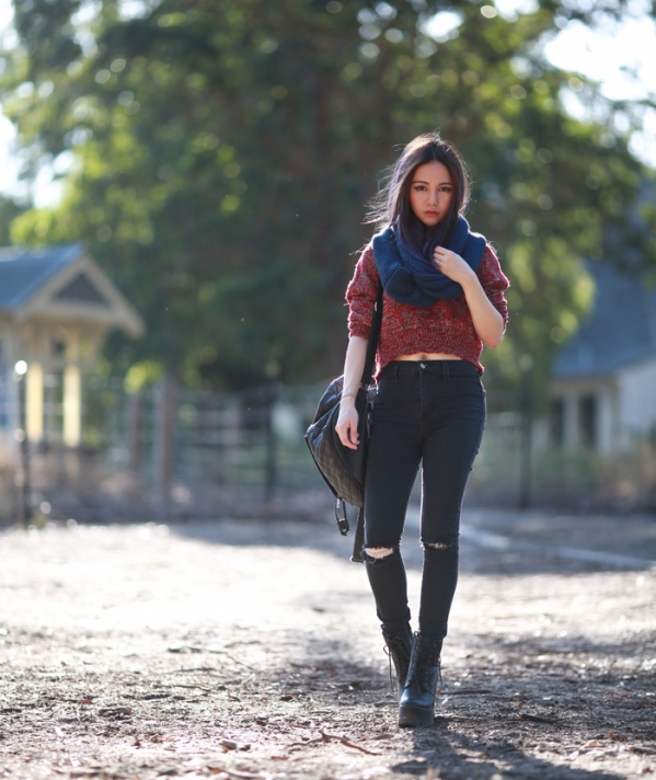 右图全套搭配:灰红杂色短款毛衣+海蓝色围脖+黑色破洞牛仔裤+黑色高跟鞋+黑色双肩包