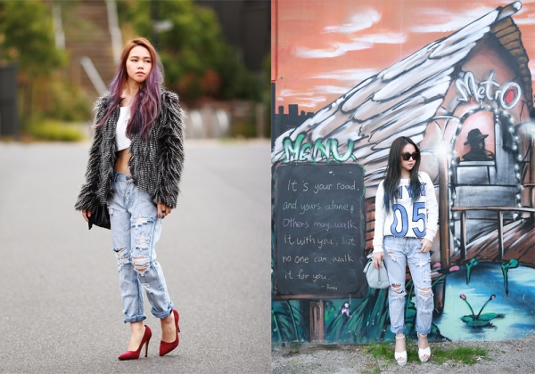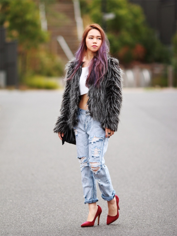左图全套搭配:皮毛外套+白色短上衣+水洗白破洞牛仔裤+红色尖头高跟鞋+黑色链条方包