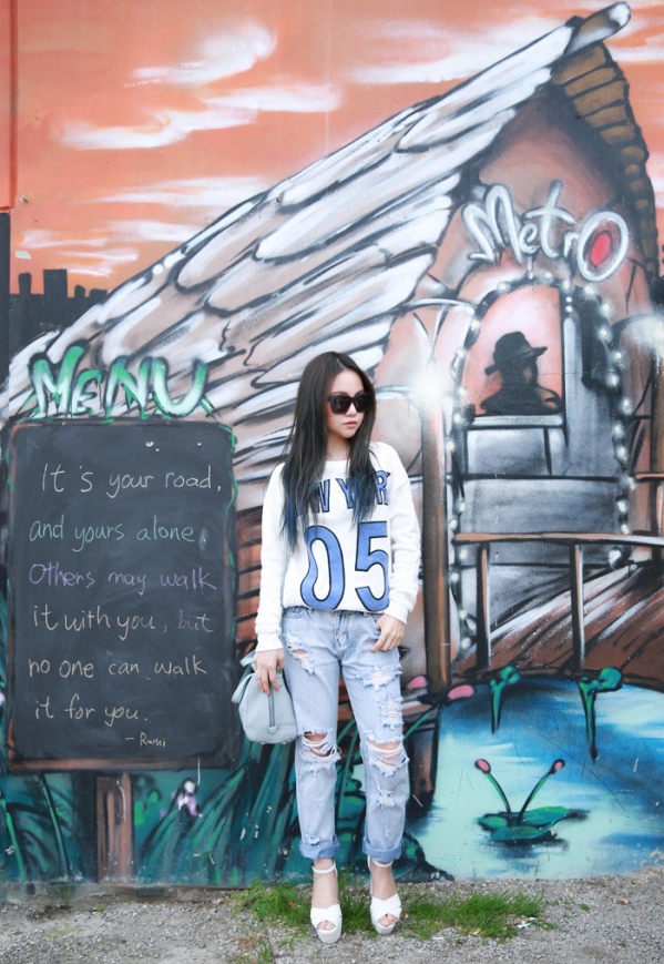 右图全套搭配:白色印花毛衣+水洗白破洞牛仔裤+白色鱼嘴鞋+蓝色包包