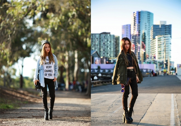 搭配比拼点评:两套街头风格很重的搭配左图更注重轻松休闲还略有一些嘻哈的调调,右图则偏帅气硬朗的风格暗色的配色和笔挺的线条。但从色彩上来看,右图并没有给全身的搭配一大亮点,让整个人显得比较晦暗也是一大失误。