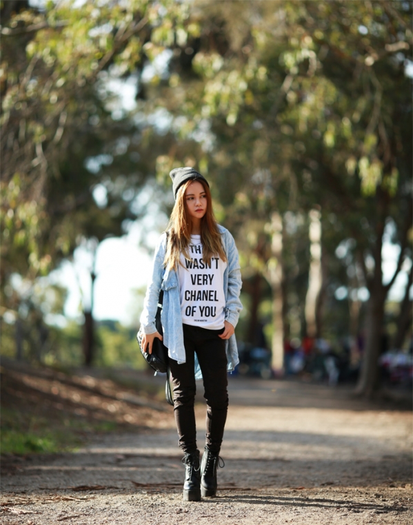左图全套搭配:毛线帽+水洗白牛仔外套+黑色牛仔裤+黑色高跟靴+黑色双肩包