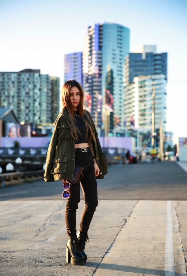 右图全套搭配:绿色军装外套+黑色短款针织衫+黑色牛仔裤+黑色高跟鞋+棕色手拿包