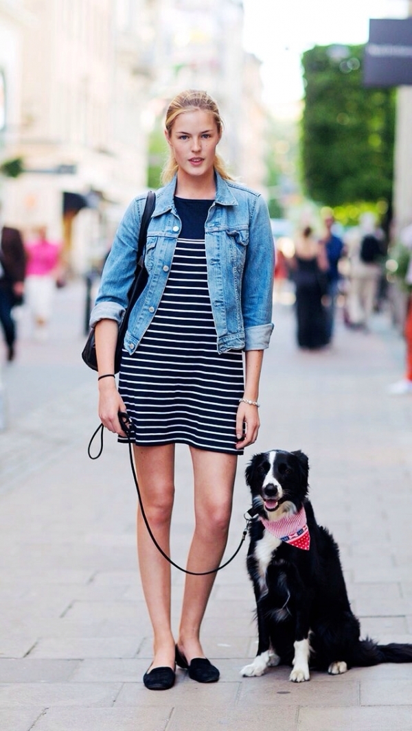 咳咳,又写到了小编最不那么喜欢的单品之一条纹裙。小编不得不承认,牛仔外套和条纹裙搭配在一起还是好看的,这样的搭配遮掩了条纹裙会给你带来的某些身体缺陷。细瘦的条纹裙搭配上外套,不仅秒秒钟Vintage风格搞定,干净的色彩搭配还能为你的出街造型加分。