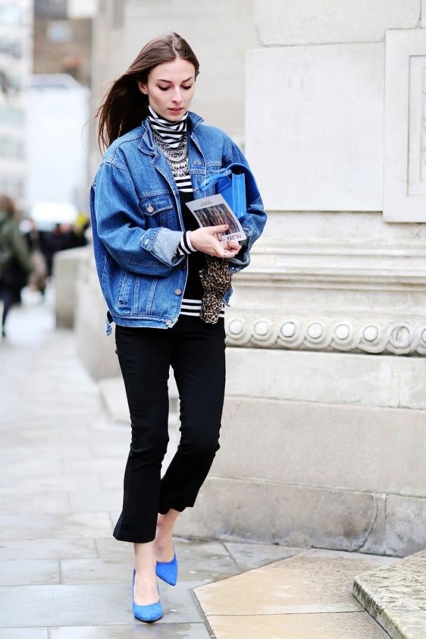 牛仔外套搭配:牛仔外套+黑色铅笔裤