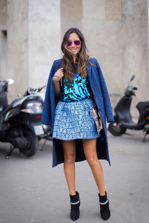 蓝色亮片上衣+豹纹风衣+印花半裙+黑色高跟靴