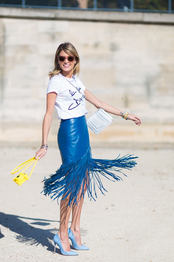 白色印花T恤+蓝色高腰皮裙+蓝色高跟鞋