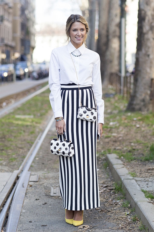 时尚看点:在人潮涌动的城市街头要想迅速的俘获眼球,必须要学会自己制造惊喜,条纹元素无疑是非常抢眼的,但颜色上的默契配合也是十分重要,而在秋季选择一款靓丽颜色的条纹元素服装往往会达到事半功倍的效果。