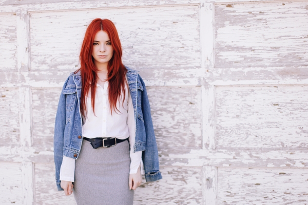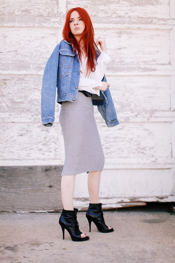 牛仔外套+白色雪纺衬衣+灰色包臀裙+高跟鱼嘴靴