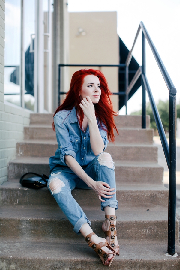 单宁衬衣+破洞牛仔裤+铁饰皮质凉鞋+黑色方包
