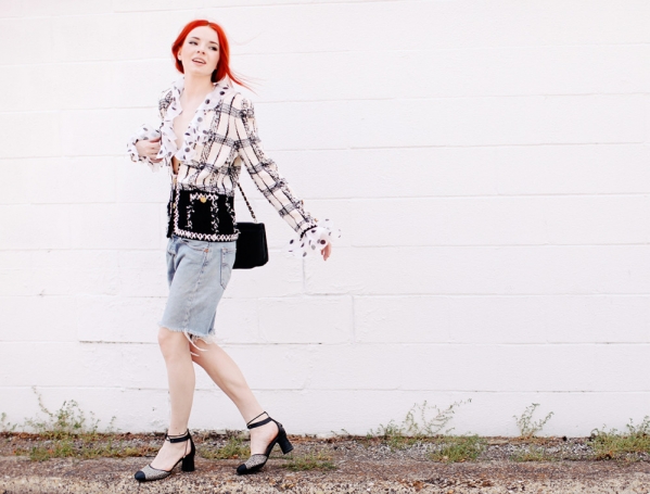 荷叶边衬衣+牛仔短裤+链条方包+黑色钉珠小高跟