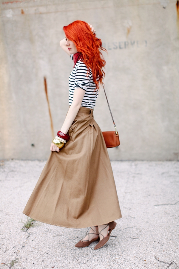 条纹上衣+棕色高腰伞裙+系带单鞋+棕色方包