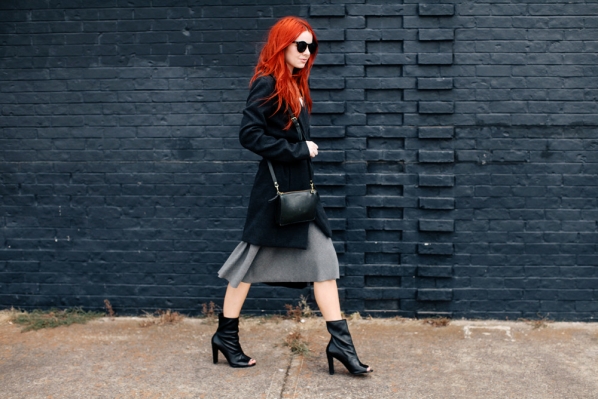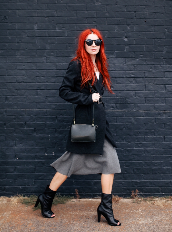 黑色风衣+白色内搭+灰色A字半裙+黑色露趾高跟靴+肩包