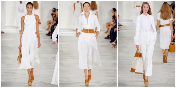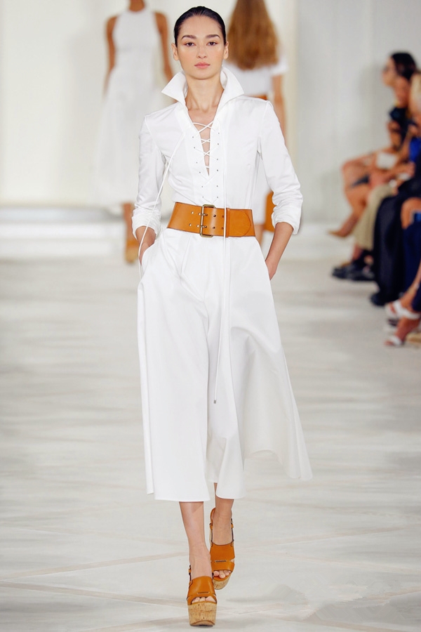 白色象征这大海的纯净与浩瀚,应用于服饰中,用来表现女性的柔美和纯洁。Ralph Lauren本次以白色的套装毫无保留的展示着这一特性,在搭配中加入了复古皮革的元素,仿佛能感受到焕发新生的海洋。