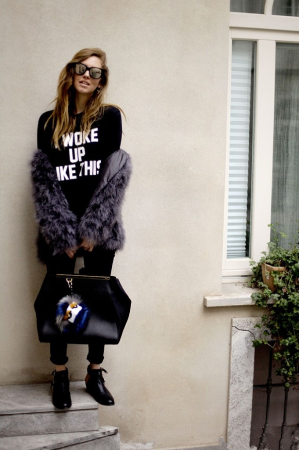 Chiara ferragni这组酷味十足的街头写真一改以往气质熟女范,宽松舒适的黑色字母T混搭上充满着魅惑色彩的羊绒外套,化身时髦潮女。