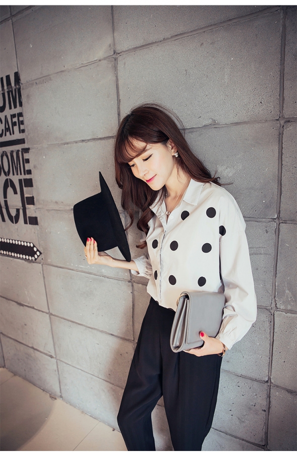 Style 4:波点衬衫+黑色小脚裤+乐福鞋+手拿包