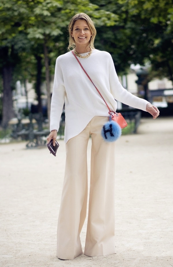 时尚看点:不规则下摆的剪裁设计,加上浅色色调,让针织衫看起来更具有简约风范,这时搭配裸色阔腿裤正好强化了这一点,让整体凌驾于休闲风之上,显得时髦又大气。当然,如果担心造型过于简单,色彩过于单调的话,可以选择搭配一款金属项链或彩色迷你小包,轻松打造时髦感。