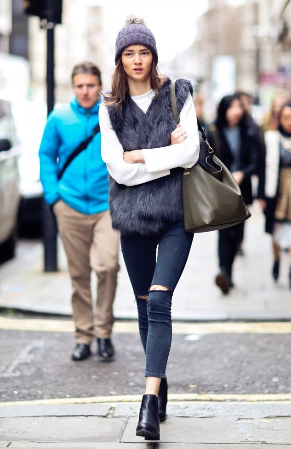 时尚看点:对于宽松的针织衫款式,可以搭配贴身的裤装来营造整体的纤细感,让你更显纤瘦哦。