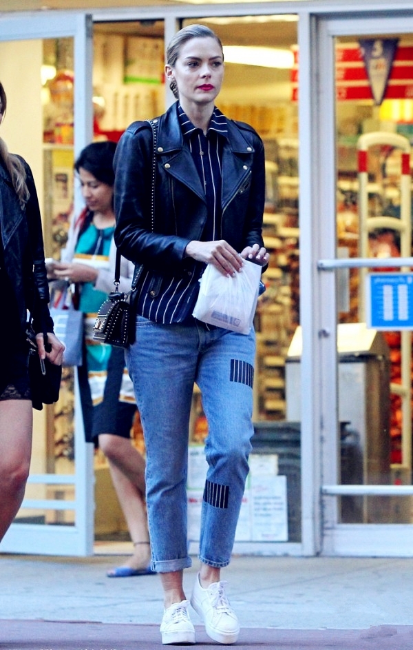 搭配看点:机车皮外套与衬衫内搭也是极为亲昵的组合,当然个性T恤,露脐上衣也很合适。下装的选择尽量能调动整体的时尚度,建议选择一些带时髦元素的裤装及裙装。