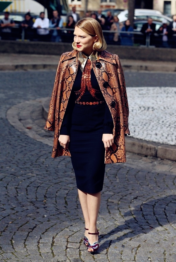 时尚看点:时髦元素的上衣在今年秋季的舞台,毫无保留的展现着。像这件蛇纹皮外套给人带来的视觉冲击感,不仅是奢侈,还透露着女王的霸气。