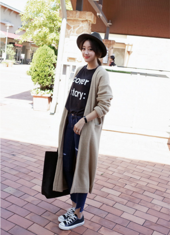 黑色字母Tee+九分紧身牛仔裤+长款杏色针织开衫+帆布鞋+礼帽+文艺布袋包